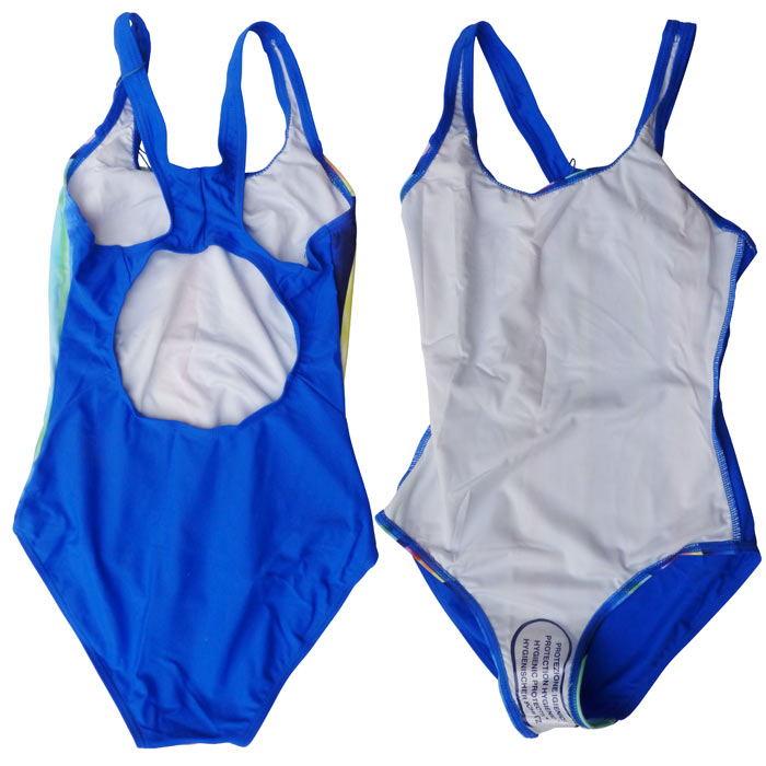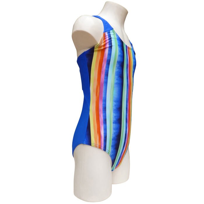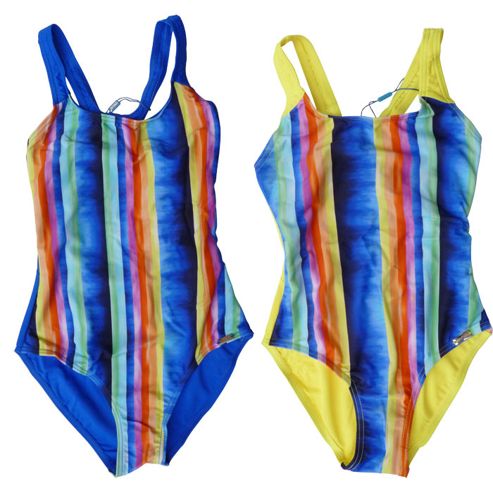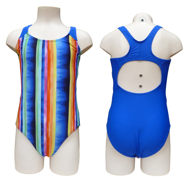 Maillot de bain fille,1 pièce doublé à l'avant, . Imprimé rayure multicolores sur le devant. Dos nageur, croisé dans le dos. 5 tailles : 2-4-6-8-10.