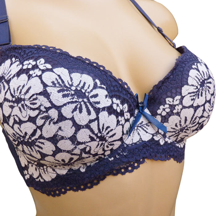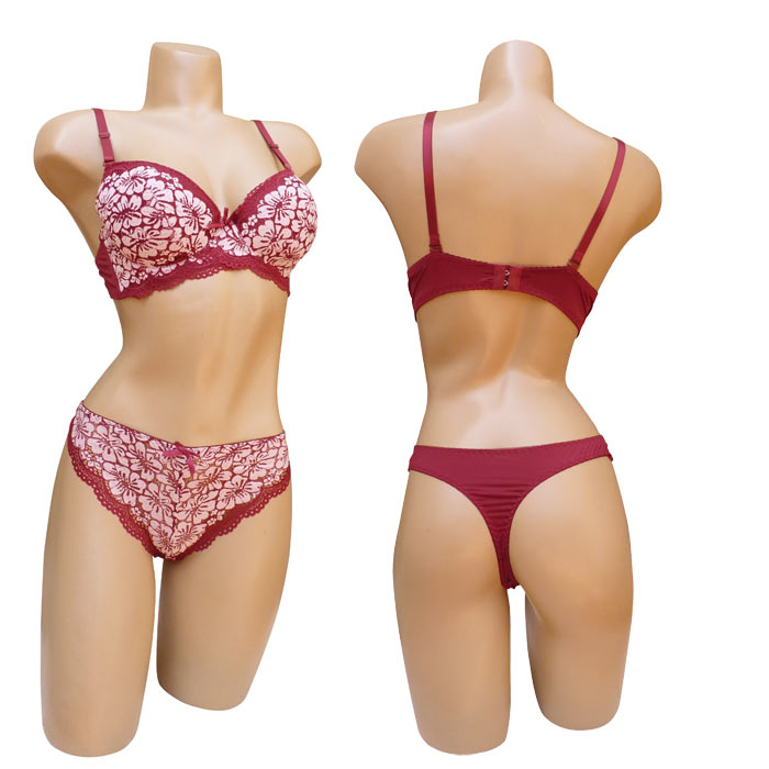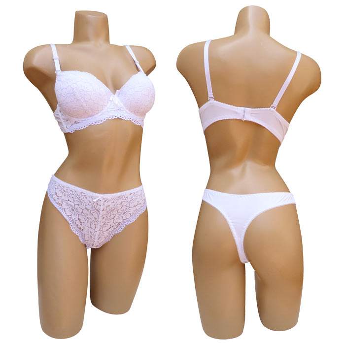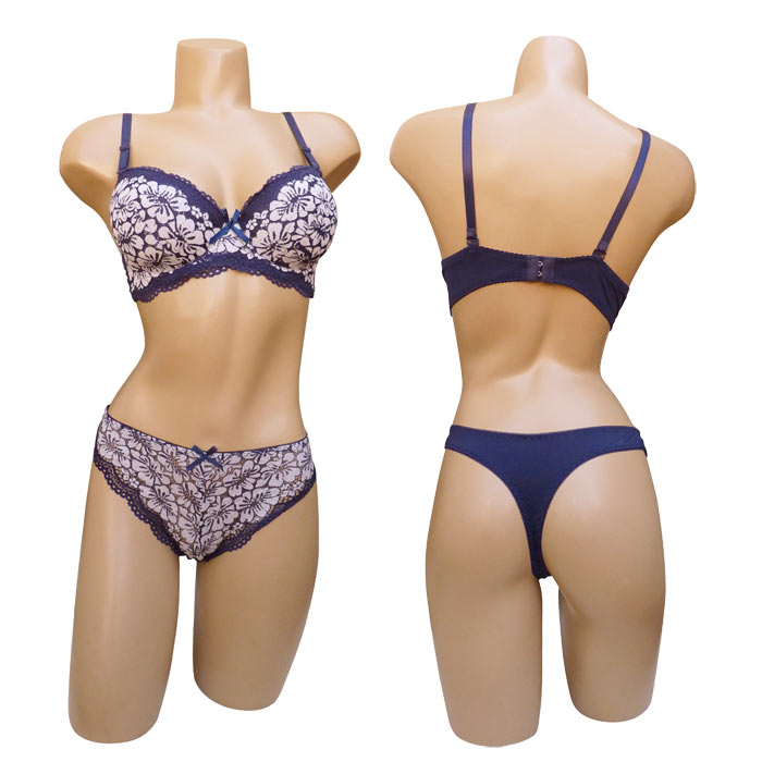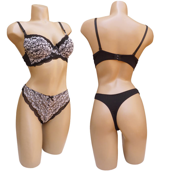 Ensemble soutien gorge avec tanga. Soutien gorge bonnet B rembourré avec armatures. Soutien gorge coques souples et préformées. Broderie sur maille filet stretch. Bande dentelle sous poitrine. Soutien gorge nœud satiné ton sur ton entre-bonnet. Brides réglables et amovibles. Fermeture dos 2 agrafes et 3 positions d'accroches. Tanga dentelle sur le devant, uni sur l'arrière doublé sur le fond. 5 tailles de soutien-gorge: 75B au 95B.