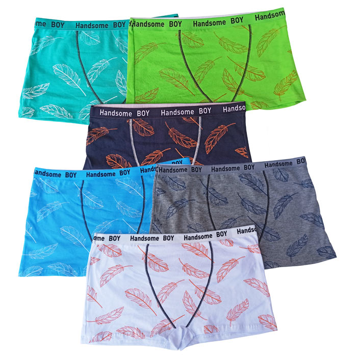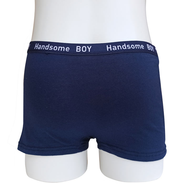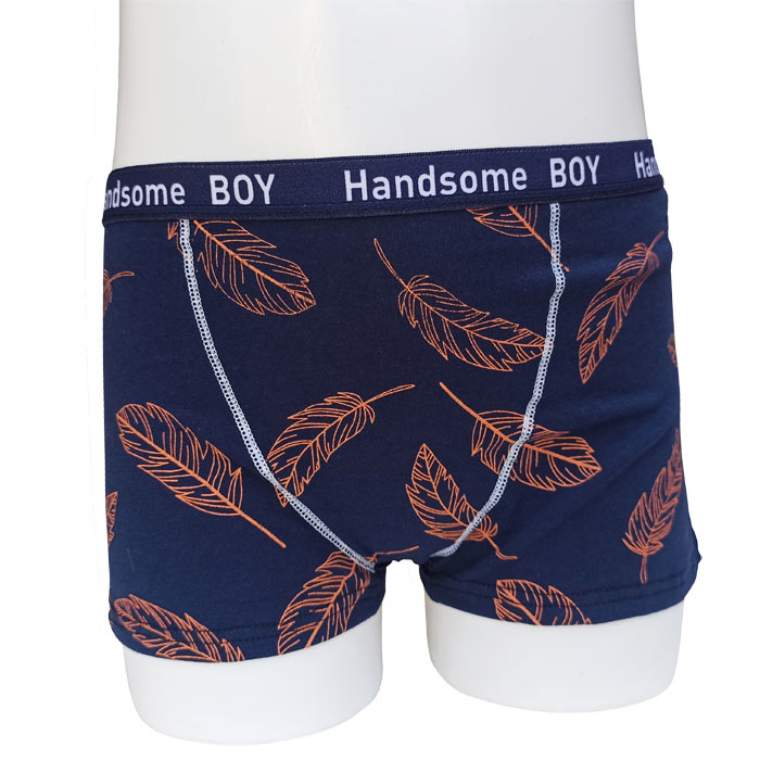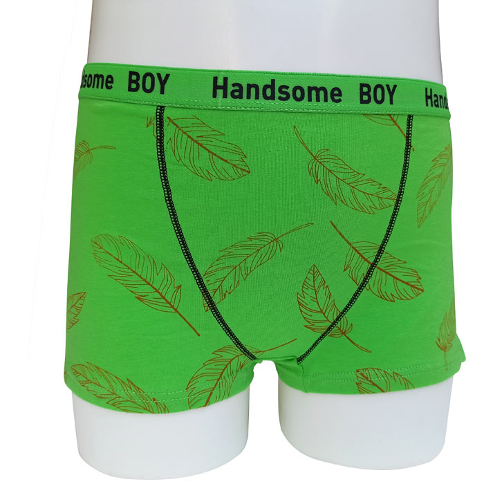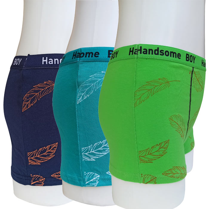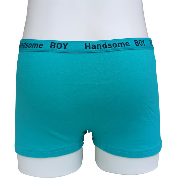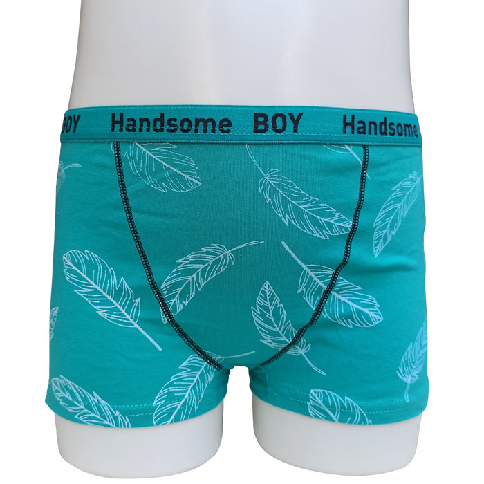 Boxer garçon, coton majoritaire. Doublé à l'avant. Ceinture élastiquée avec inscription "Handsome boy" à la taille. Motif "palmiers" sur le devant, uni sur le derrière. 4 tailles : 4/6 ans - 8/10 ans - 12/14 ans - 16/18 ans