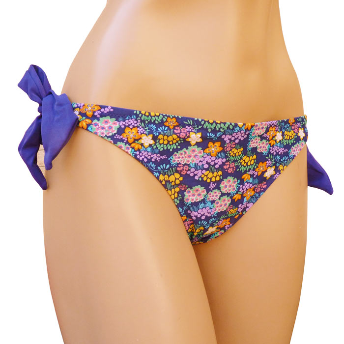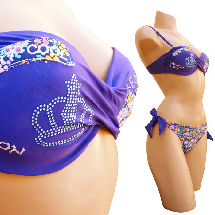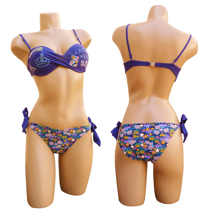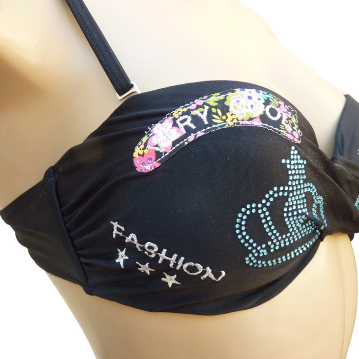 Maillot de bain 2 pièces avec slip. Soutien gorge forme bandeau twisté, rembourré coqués avec armatures. Motif "carré tissu colorés cousu avec strass et différentes inscription" sur le haut du maillot. Soutien gorge bretelles amovibles, se clipse dans le dos. Bas du maillot entièrement doublé avec imprimé "fleurs colorées" sur le devant et sur l'arrière, s'attache sur les côtés. 4 tailles: 34/36 au 38/40.