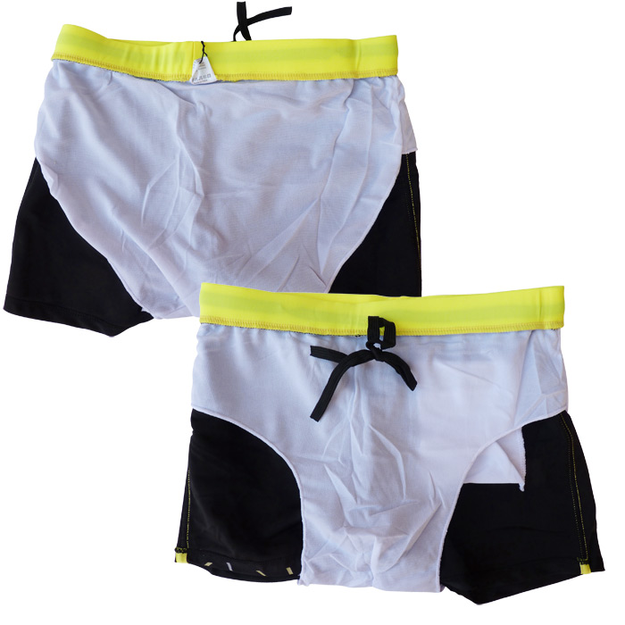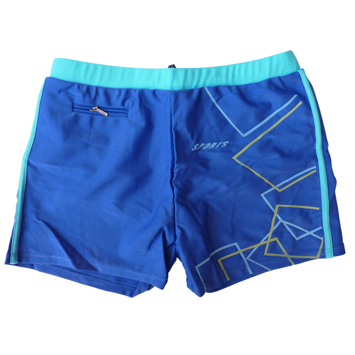 Boxer de bain homme, doublé d'un fin filet intérieur (en forme de slip). Lacet de resserrage à la taille. imprimé graphique sur un côté du boxer et bande verticale de l'autre côté. Poche extérieure avec fermeture éclair. 4 tailles : 38/40 - 40/42 - 42/44 - 44/46. Reste que des tailles XL (5 pièces) et 1 taille L
