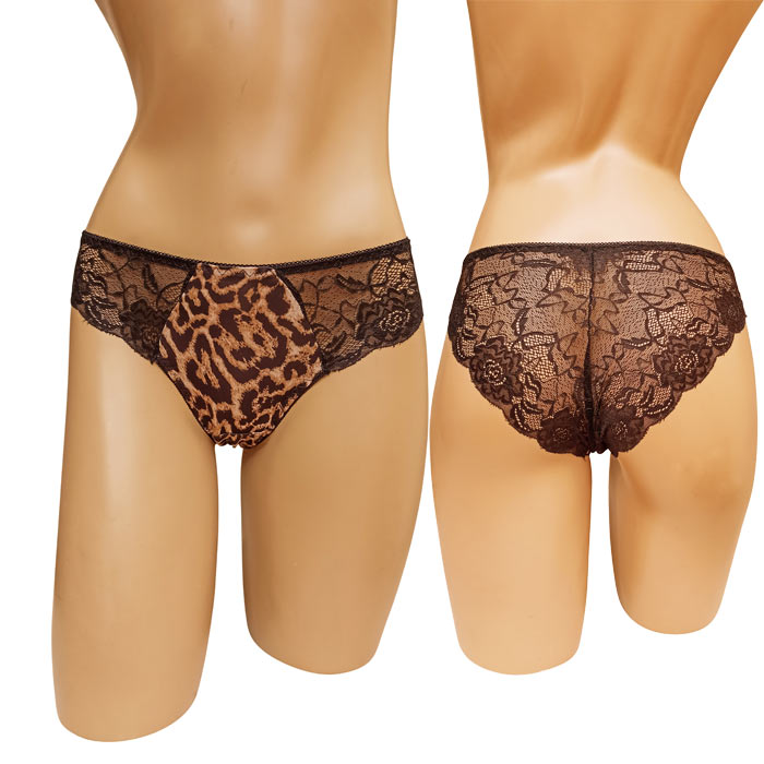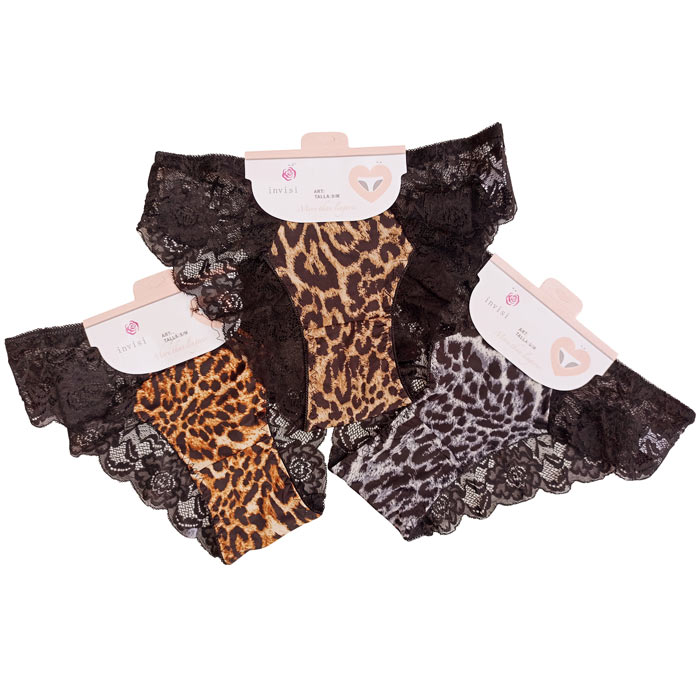 Slip dentelle et microfibre, léger, agréable au toucher et à porter. Taille élastiquée. Culotte imprimé "léopard" sur le devant, fleurs brodées sur maille filet stretch sur les côtés et le derrière. Fond doublé. 3 coloris différents, voir photos. 2 Tailles.