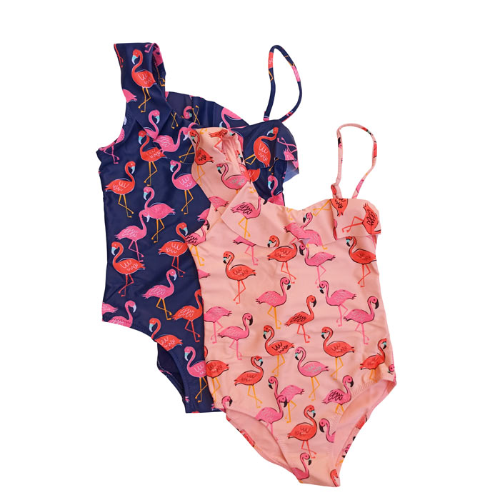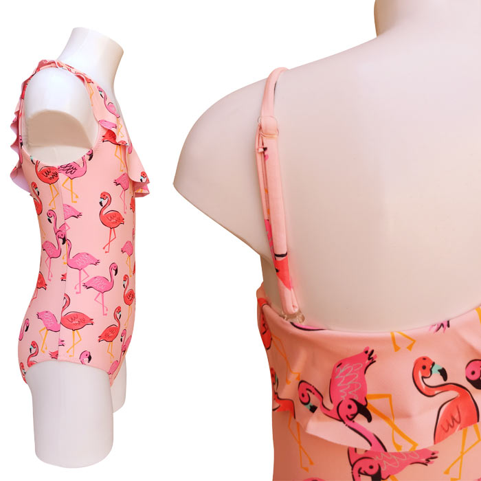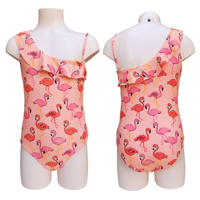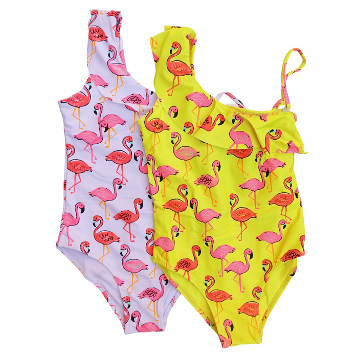 Maillot de bain fille,1 pièce. Maillot entièrement doublé. Brides asymétriques sur un côté et mini volant contrasté sur le pourtour du soutien-gorge. Imprimé "flamands rose" sur l'ensemble. 4 tailles: 2/3 ans - 3/4 ans - 5/6 ans - 7/8 ans