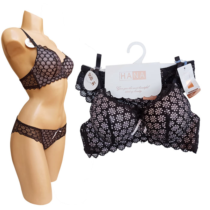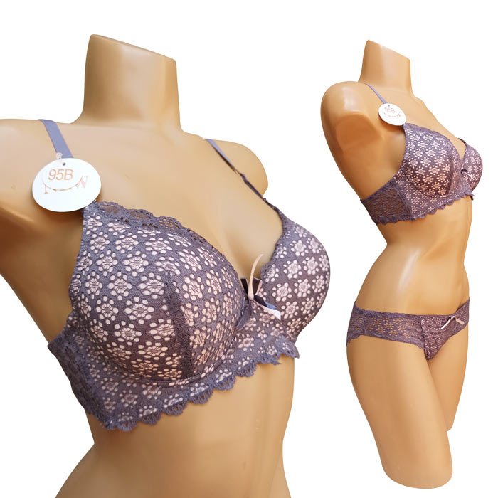 Ensemble soutien gorge avec slip. Soutien gorge coques souples avec armatures, bonnet B. Motifs "fleurs" brodés sur maille filet stretch. Nœud bicolore satiné entre-bonnet. Brides réglables et amovibles. Slip, rappel de la broderie sur l'ensemble de la culotte. 6 tailles. Attention : Taille européenne indiqué sur étiquette.
