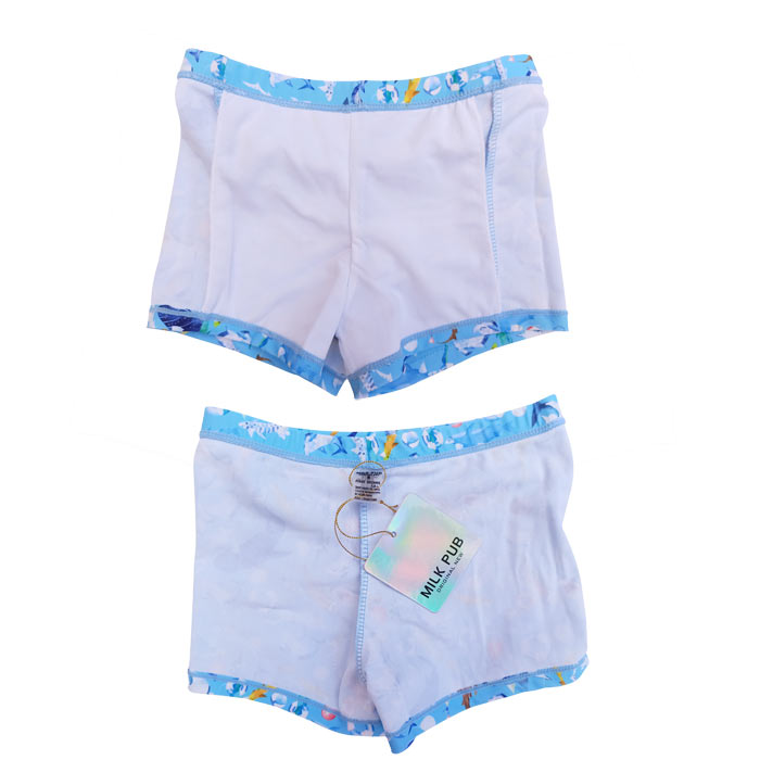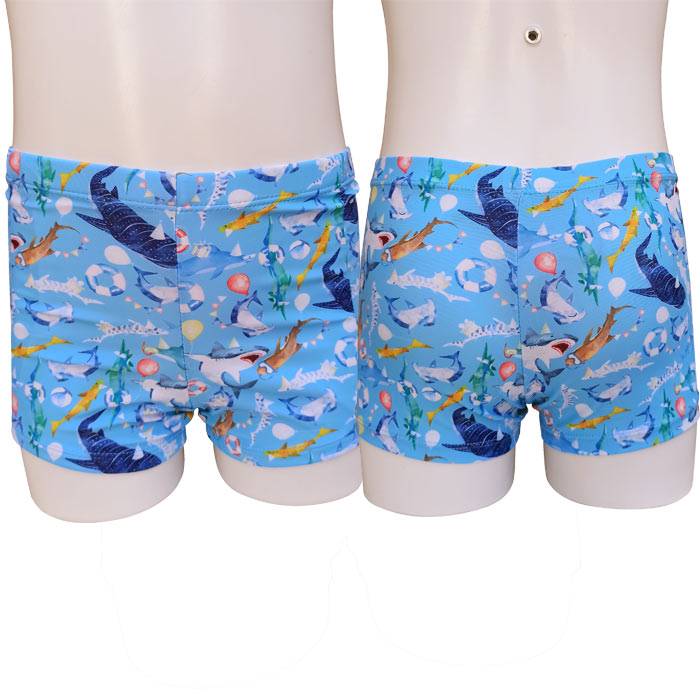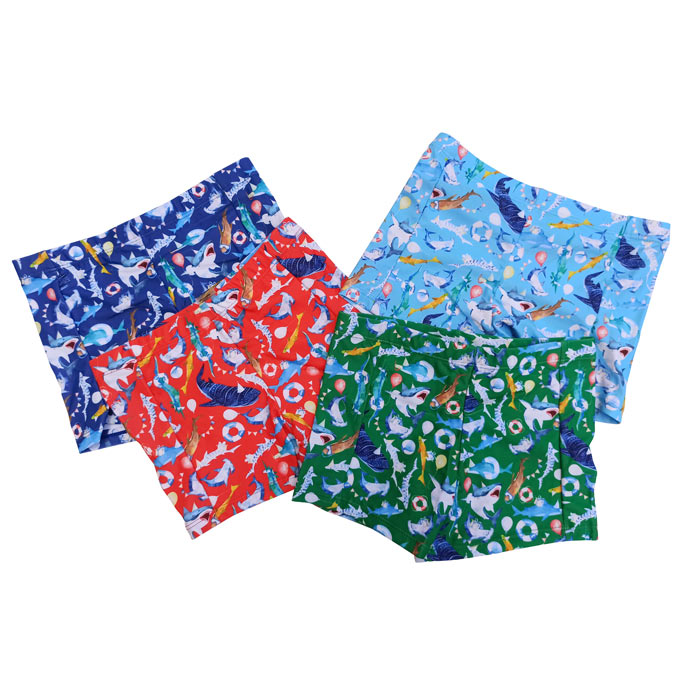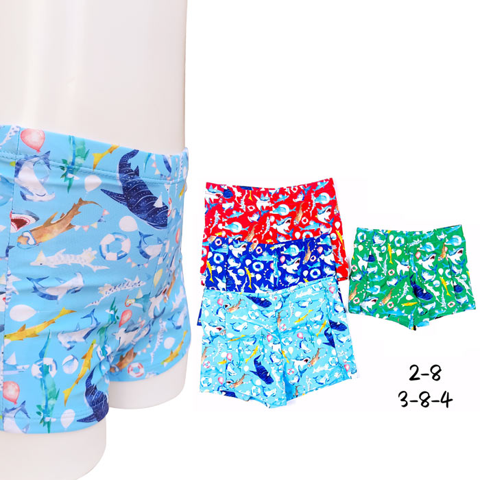 Boxer de bain garçon, doublé d'un fin filet intérieur à l'avant, taille élastiquée. Boxer de bain avec motif "baleines, poissons différents..etc" sur l'ensemble du boxer de bain. 4 tailles : 2 ans à 8 ans. 4 couleurs différentes.