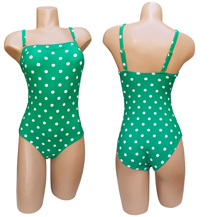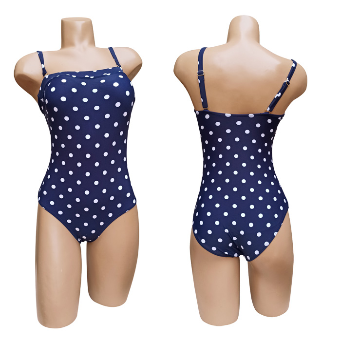Maillot de bain femme 1 pièce, entièrement doublé . Soutien gorge forme bandeau sans armatures. Maillot "imprimé pois" sur 'ensemble du maillot. Bretelles réglables et amovibles. 3 couleurs et 5 tailles indiquées sur étiquette : du 36/38 au 44/46.