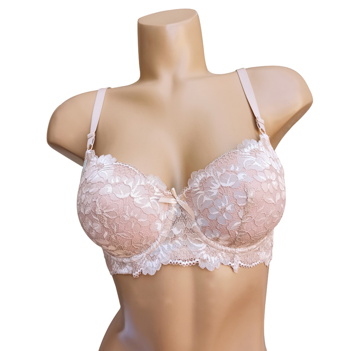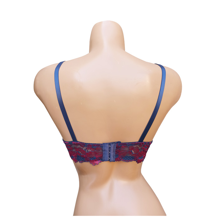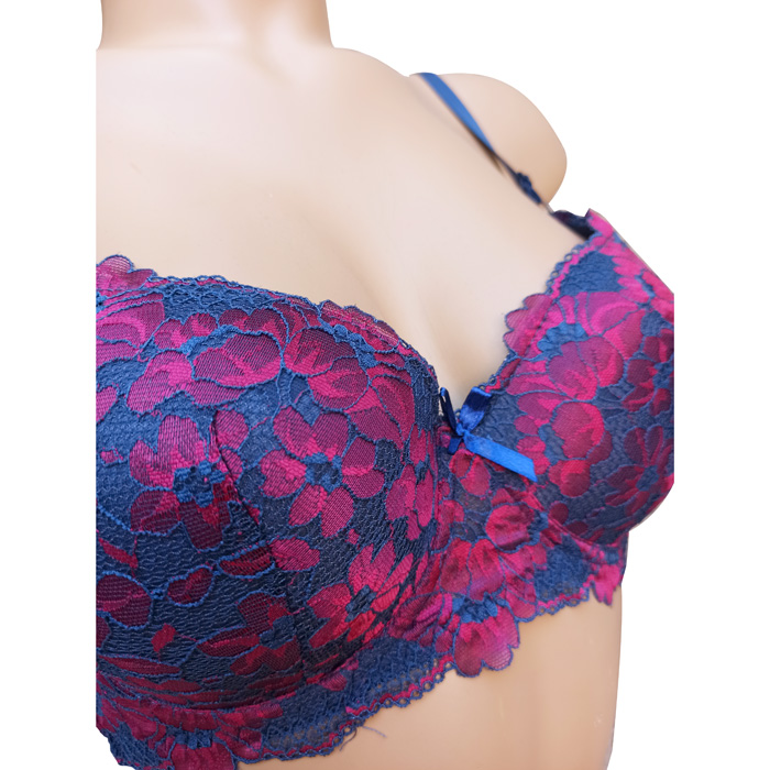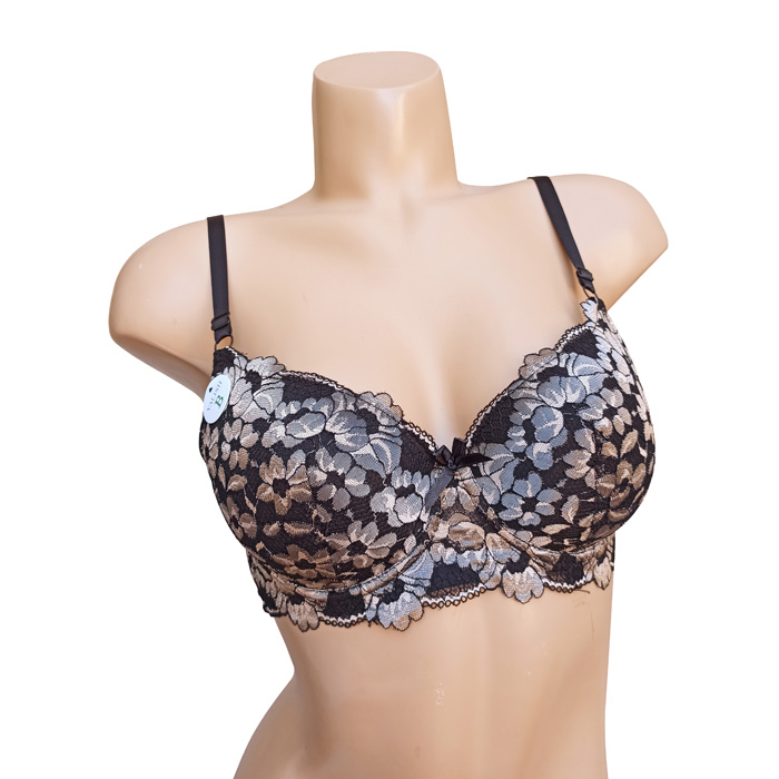 Soutien gorge avec armatures, Bonnet B. Soutien gorge balconnet, coques souples. Motif "fleurs brodées" sur maille filet stretch. Brides réglables non amovibles. 6 Tailles. Attention : taille européenne indiquée sur étiquette. Fermeture dos par 3 agrafes 3 positions d'accroches.