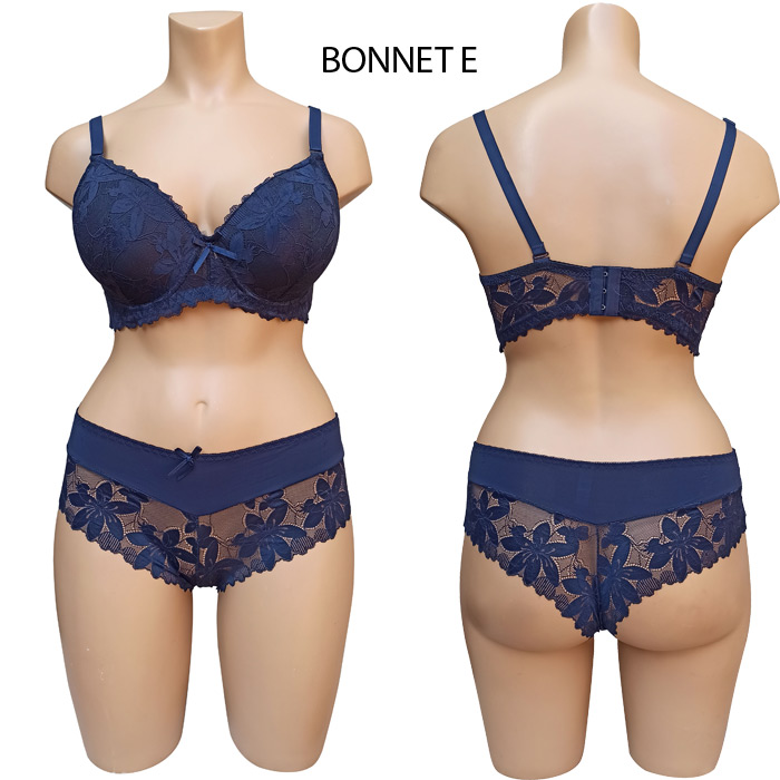 Ensemble soutien-gorge grande taille, bonnet E, soutien gorge coques souples avec armatures. Soutien gorge dentelle "fleurs" sur maille résille stretch sur l'ensemble du bonnet. Nœud satin entre-bonnet. Dos fermeture3 agrafes 3 positions d'accroches. Bretelles réglables et amovibles. Culotte tout en dentelle. Livré sur cintre. 4 Tailles : 95E à 110E dont 100E et 105E en double