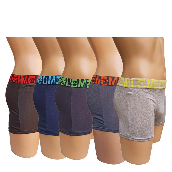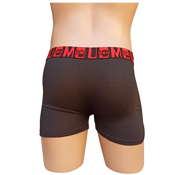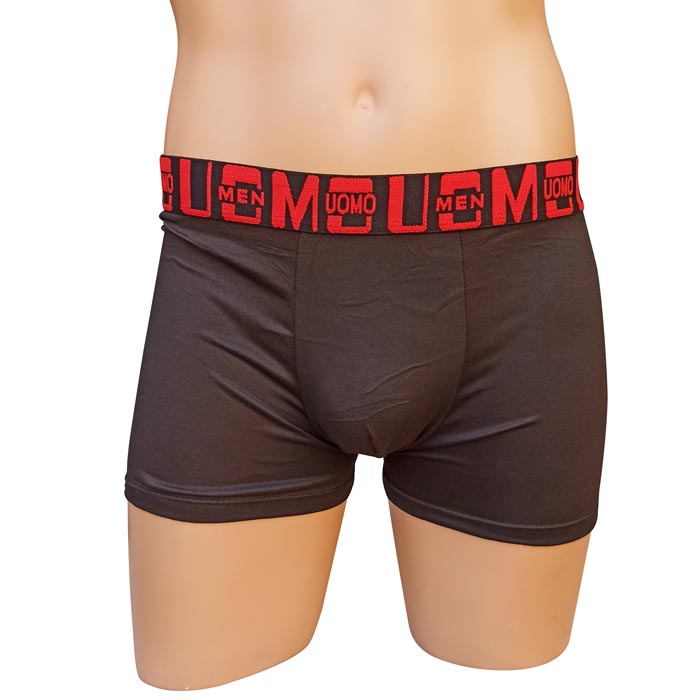 Boxer homme coton majoritaire, partie avant doublée.Boxer entièrement uni, ceinture élastiquée à la taille avec motif graphique et inscription "UOMO". 5 tailles indiquées sur étiquettes : M-L-XL-2XL-3XL.