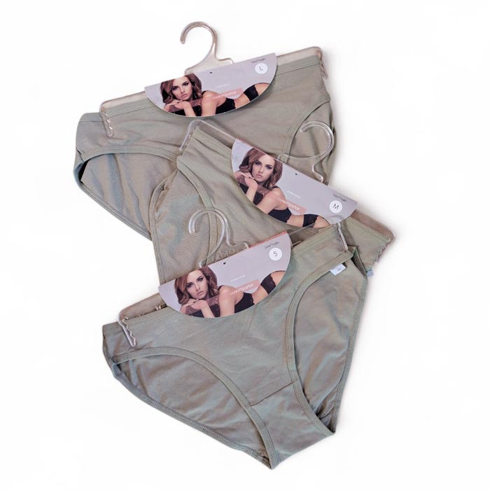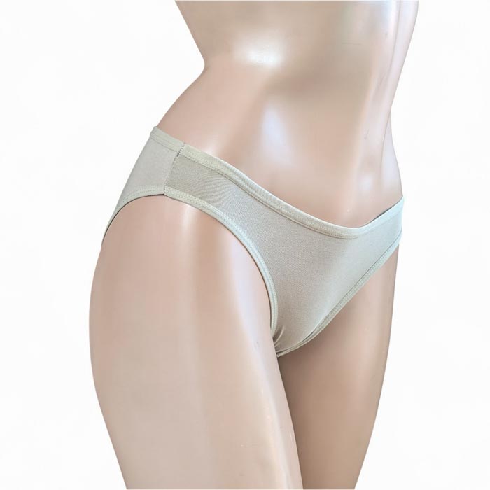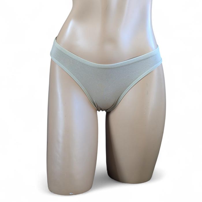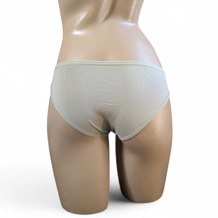 Slip femme, coton majoritaire. couleur verte clair ou couleur nature. Taille élastiquée. Fond doublé. 3 Tailles : S-M-L le tout livré sur cintre.
