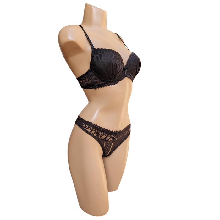 Ensemble soutien gorge avec tanga. Soutien gorge coque avec armatures. Bonnet B, broderie sur maille résille stretch. Nœud satin entre bonnet. Bretelles fine et réglable. Tanga, avec rappel de la broderie sur le devant, uni à l'arrière. 5 tailles : 75B à 95B dont 85B en double.