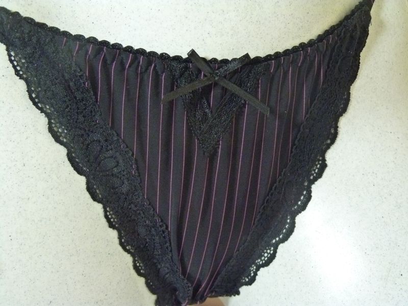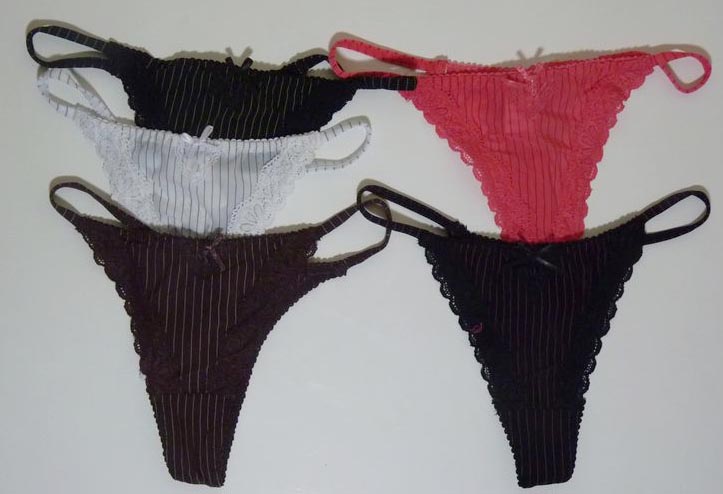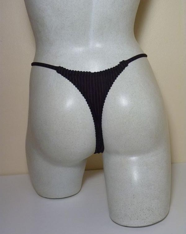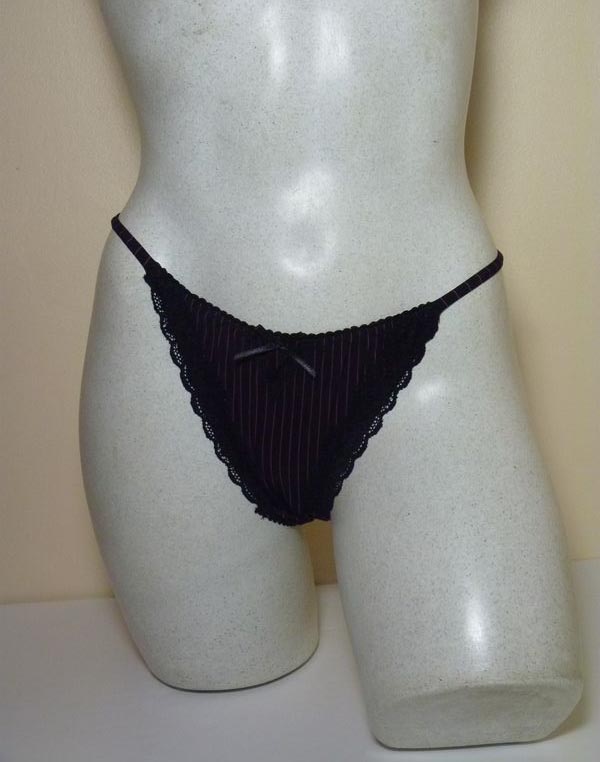 Tanga micro fibre lycra, doux au toucher, tissu fluide et frais. Motifs fines rayures bicolores bordés d'un ruban fleuri stretch sur le pourtour des cuisses à l'avant. Petit triangle de dentelle à la taille. Brides lycra rayé sur les côtés. Ce string est assorti au soutien gorge ST493. 3 tailles, très extensible