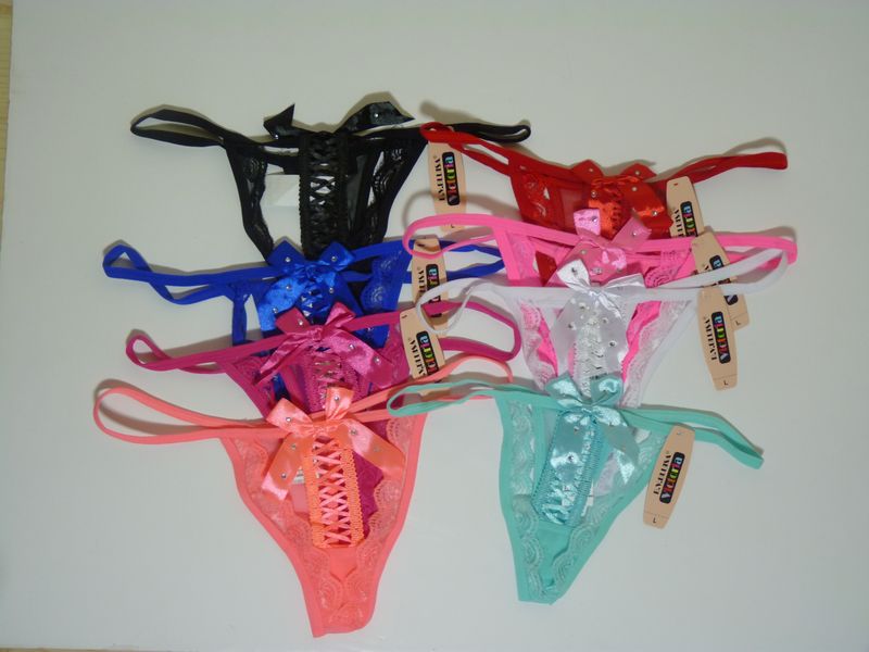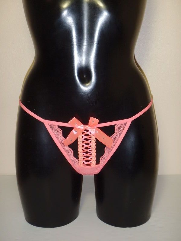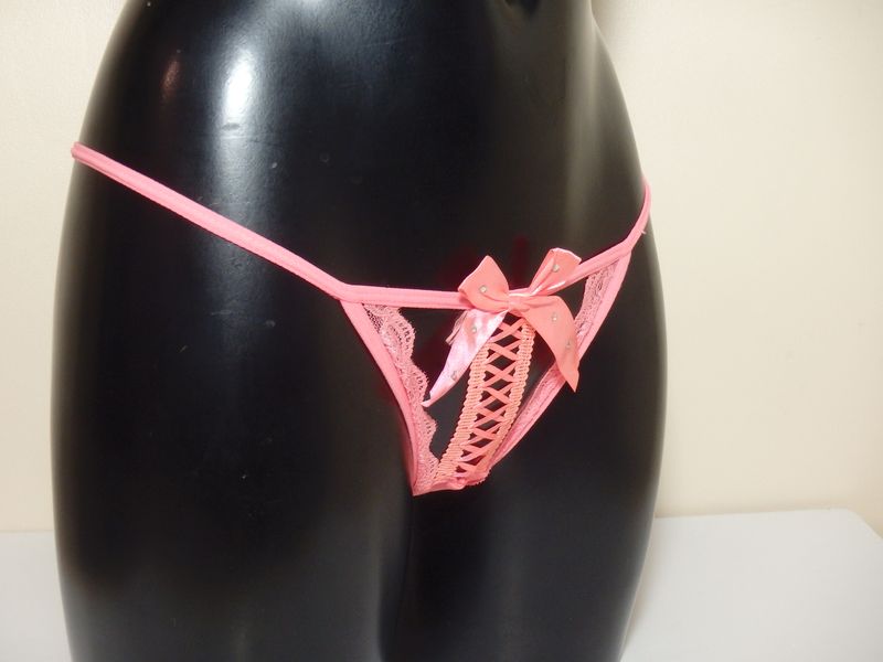 Tanga sexy résille stretch à l'arrière, bande de ruban lacet à l'avant. Galon en dentelle stretch sur les cuisses bordé d'un élastique coton plat. Fine bride stretch sur les côtés. Large noeud satin avec strass devant. 3 Tailles, très extensible