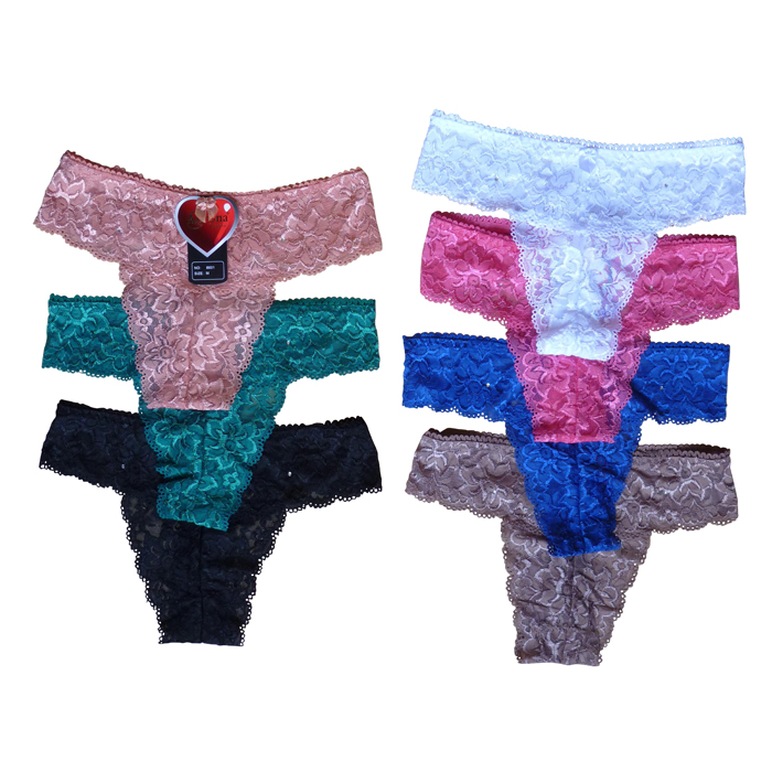 Tanga en dentelle, coton majoritaire. Fleurs brodées sur maille filet stretch. Strass et nœud satiné sur le devant. 3 tailles : M, L, XL.