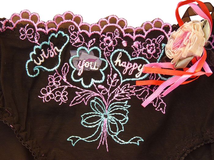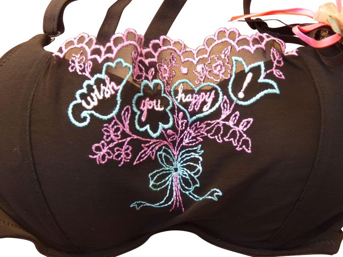 Ensemble soutien gorge premières poitrines, forme bandeau, avec baleines recouvert d'un voile bandeau brodé "bouquet de fleurs et de feuilles" et inscription " Wish you Happy" sur maille résille stretch -- "Broche de fleurs" amovible sur le côté gauche. Slip, rappel de la broderie sur le devant, transparent sur l'arrière. Petit bonnet B. Brides amovibles et réglables. Indiqué 34/75B sur étiquette. 1 taille.