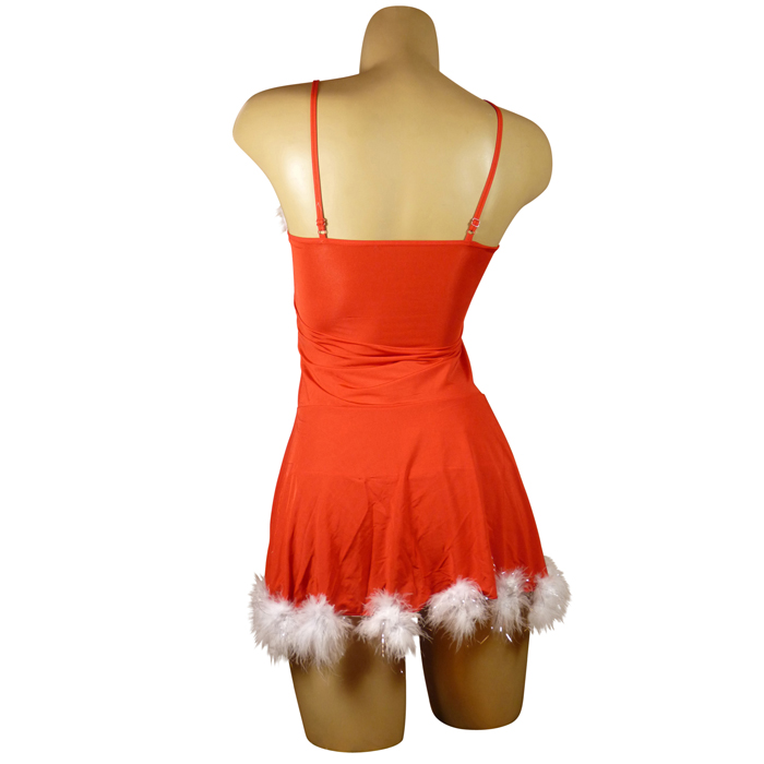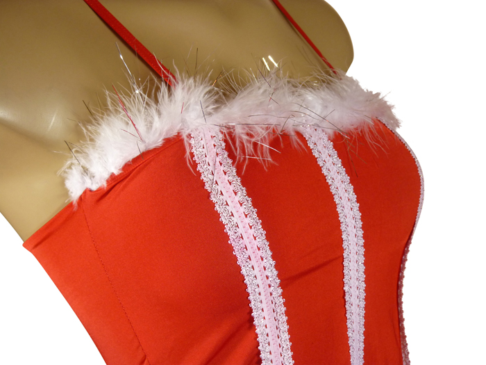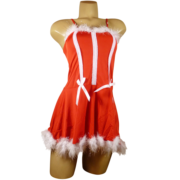 Nuisette rouge "spécial noël", avec string, forme évasée. Bande de fourrure blanche et fils d'argent sur le bord de la poitrine et sur le pourtour en bas, type "flocon de neige". 3 bandes rubans satinés verticaux à l'avant, dont 2 finition "nœuds papillon". Fines brides réglables. String ficelle uni. 2 tailles : S-M/L-XL