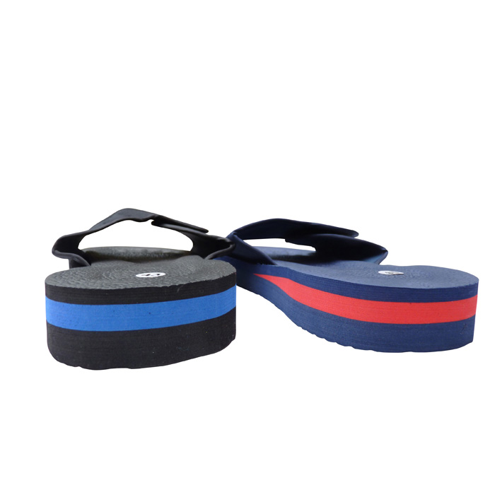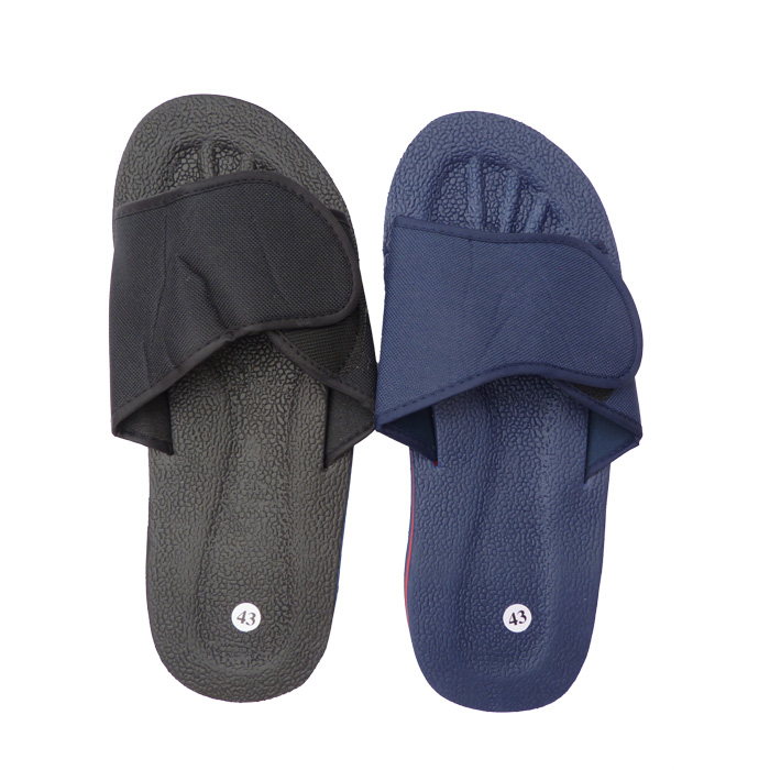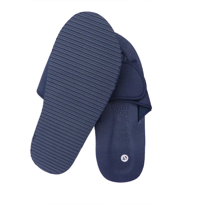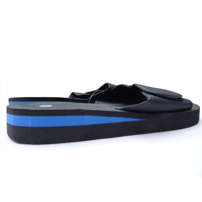 Tongue-Mule homme ultra légère. Semelles intérieure et extérieure antidérapantes. Brides larges réglable avec scratch sur le pied. Semelles rigides en mousse durcie. Hauteur semelle d'environ 3,4 cm au plus haut. 6 tailles et 2 coloris différents. Majorité coloris Noir/bleu