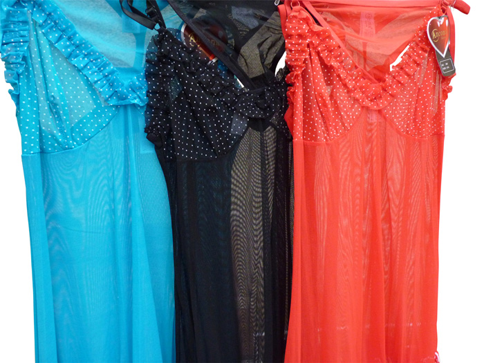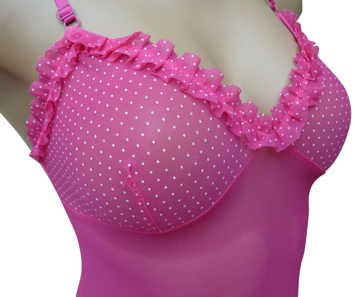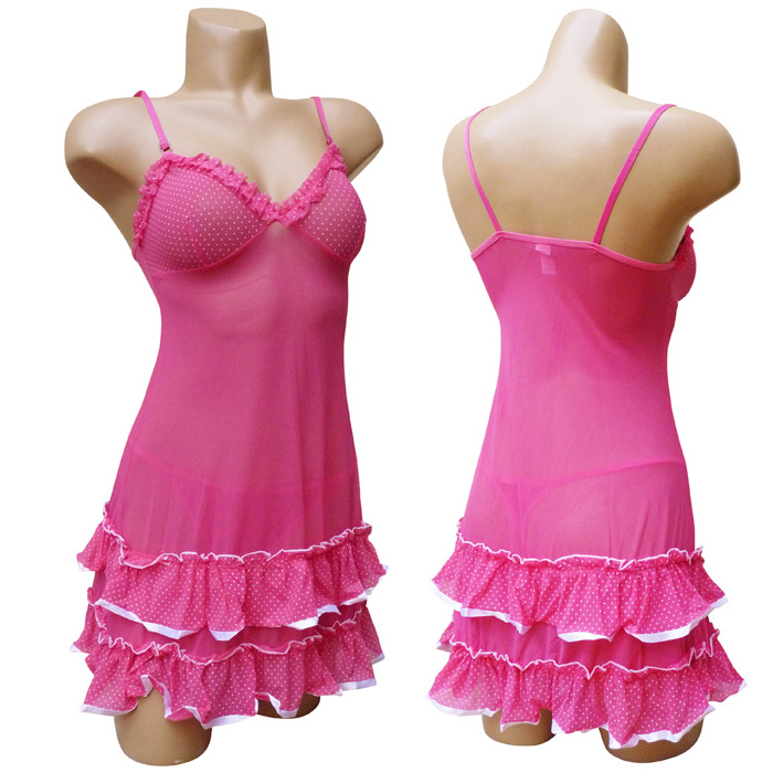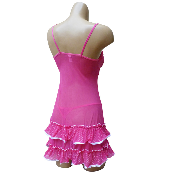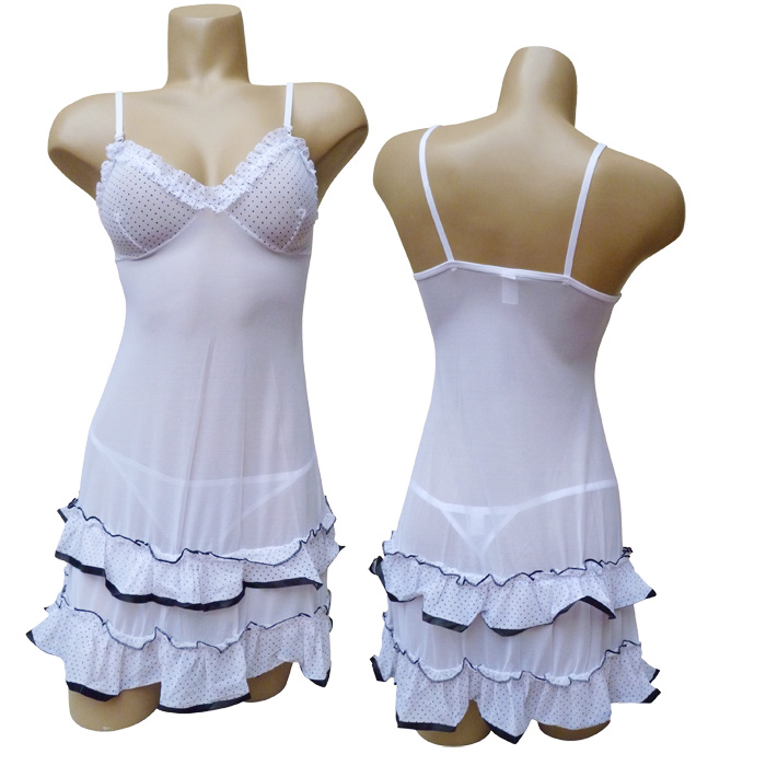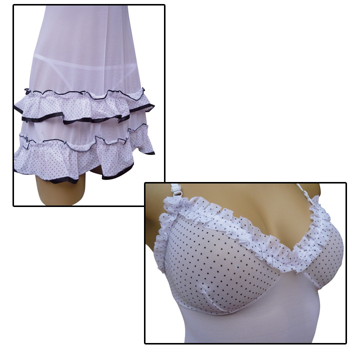 Nuisette voile stretch avec string. Soutien gorge résille imprimé "pois", bordé d'un volant froncé sur la partie supérieure. Forme évasée avec petits volants superposés sur le bas de la nuisette. Bordé d'un galon contrasté. Fines brides réglables. Nuisette livrée sur cintre. 2 tailles.
