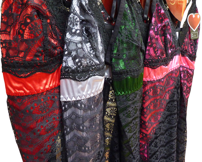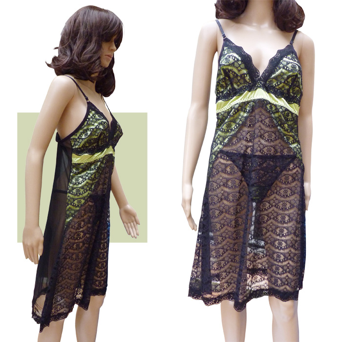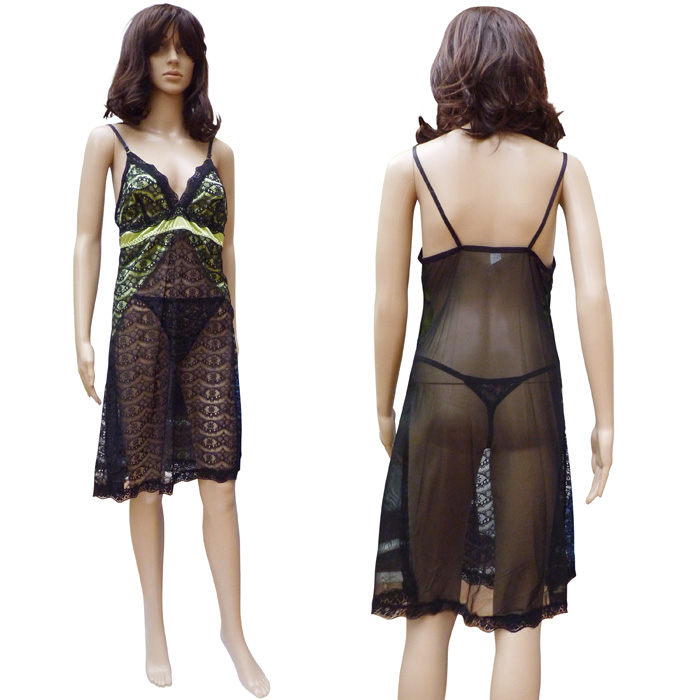 Nuisette sexy longueur genou, en dentelle stretch, broderie sur maille résille stretch avec tanga. Soutien gorge forme triangle non rembourré sans armatures. Galon de dentelle sur la partie haute et intérieure du bonnet. Bande de tissu satiné sous poitrine. Fine brides réglables, non amovibles. Tanga, filet sur maille résille stretch à l'avant rehaussé par le rappel du tissu satiné sur le bas du tanga. 2 tailles : S/M et L/XL.