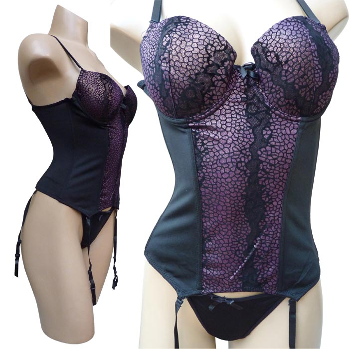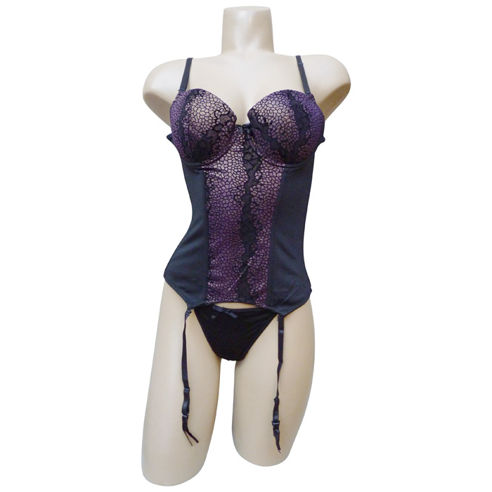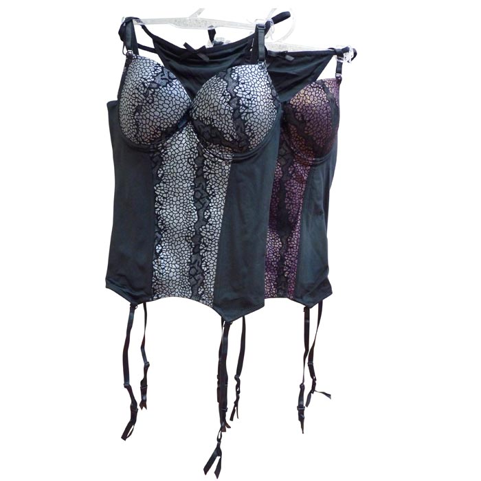 Ensemble bustier avec tanga- Soutien gorge forme balconnet, coques souples, bonnet B. - Tissu moiré et micro pailleté. Bustier avec agrafes dans le dos, 3 positions - Tanga, couleur uni, nœud satiné sur le devant.- simples brides sur le côté.porte jarretelles amovible. 3 tailles : 38B-36B-34B