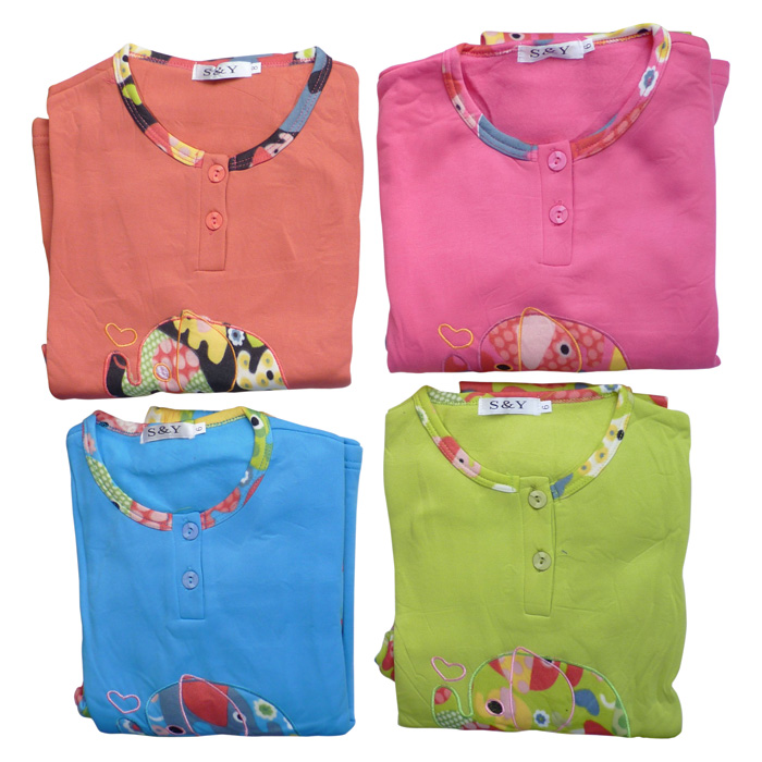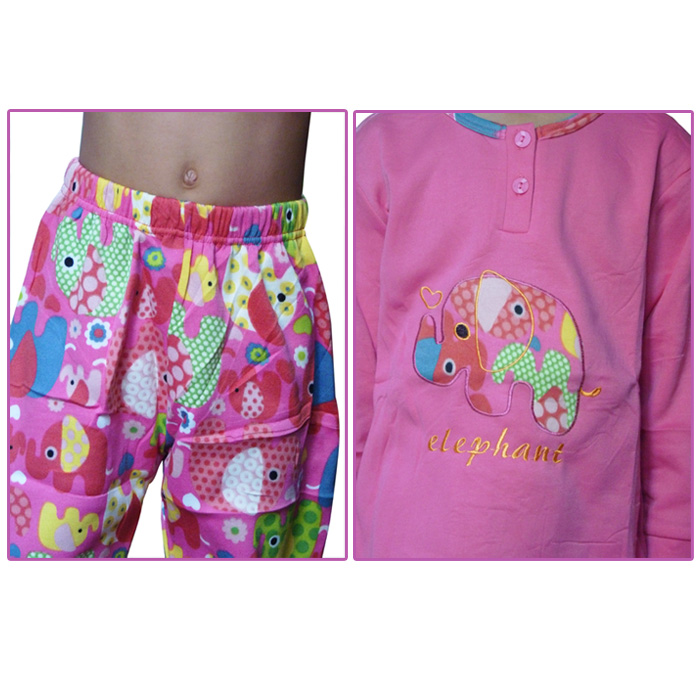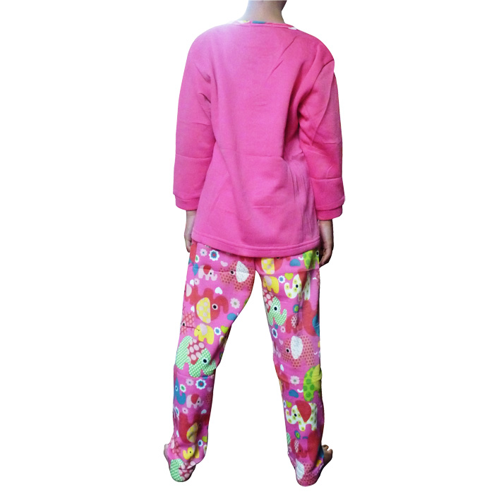 Pyjama fille polaire. Intérieur chaud et confortable. Broderie "éléphants" avec inscription mot "éléphant" sur le devant de la tunique. Col rond contrasté boutonné. Pantalon, taille élastiquée avec motif "éléphants" colorés sur l'ensemble. 6 tailles de 4 à 14 ans, et 4 couleurs. Pyjama Taille grand d'au moins une taille.