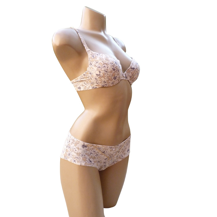 Ensemble soutien gorge avec boxer en microfibre, coloris gris, imprimé fleurs avec liseré de dentelle sur le bonnet. Soutien gorge balconnet. Petit bijoux entre bonnet. Brides réglables et non amovibles. 1 agrafe dos avec 3 positions. Boxer imprimé fleurs, rappel liseré de dentelle sur le devant de la culotte. 3 tailles soutien gorge: 90C, 95C, 100C et 2 tailles boxer : 40/42 (x1) - 42/44 (x3)