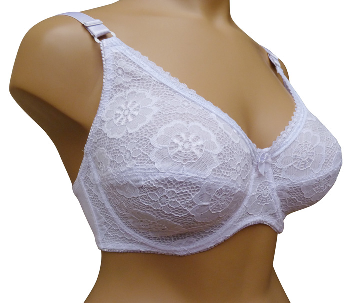 Soutien gorge grande taille bonnet E, non rembourré avec armatures. Fleurs sur maille résille stretch, dentelé sur la partie supérieure. Bretelle réglable non amovible. Agrafes dos. 6 tailles.