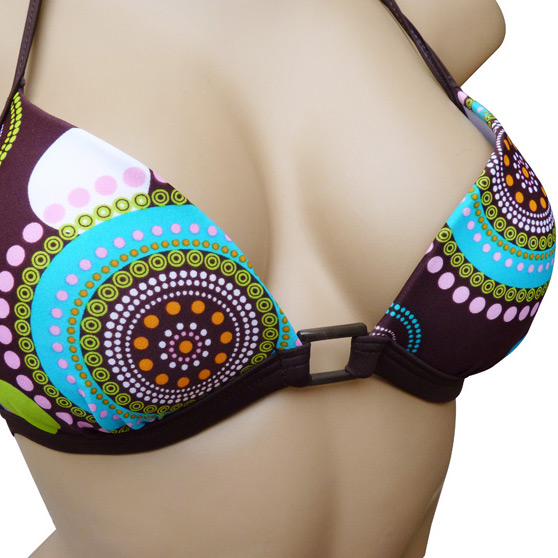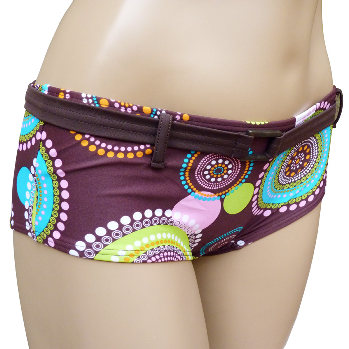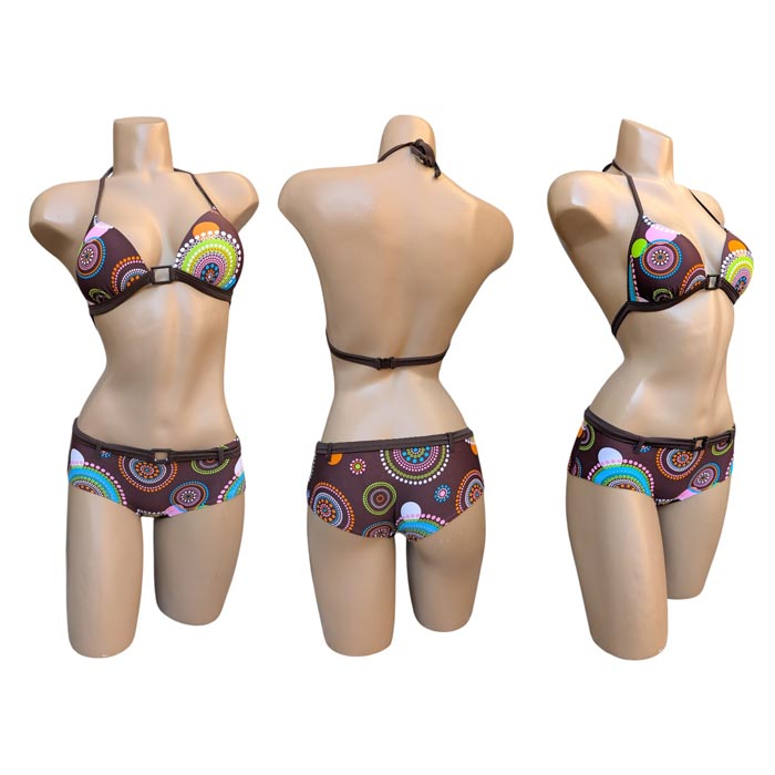Maillot de bain femme, 2 pièces boxer. Soutien gorge triangle avec motifs colorés ronds type "aztec". Brides qui s'attachent derrière le cou et se clipse dans le dos. Anneau carré entre les bonnets. Coques souples sans armatures. Boxer entièrement doublé, devant et derrière avec rappel imprimé "aztec". Petite ceinture à la taille, rehaussé par une boucle carré à l'avant ton sur ton. 5 tailles de 36 à 44.