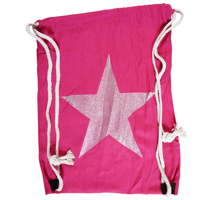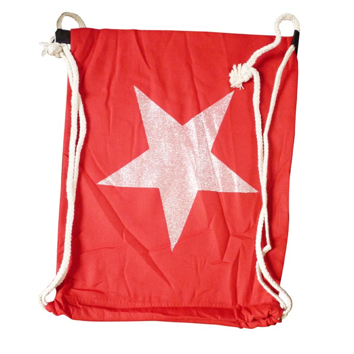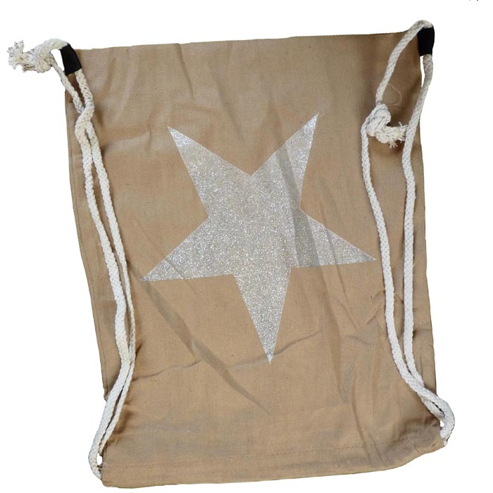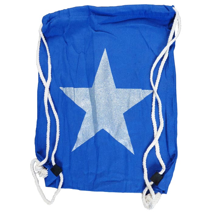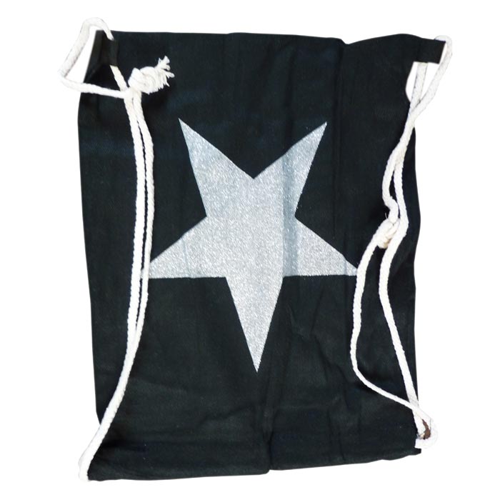 Sac de plage à porter dans le dos. Bandoulières en corde de marin et nœuds "marins", nœud coulissant. Motif "grande étoile" sur fond uni. Largeur=33cm, longueur=40cm.