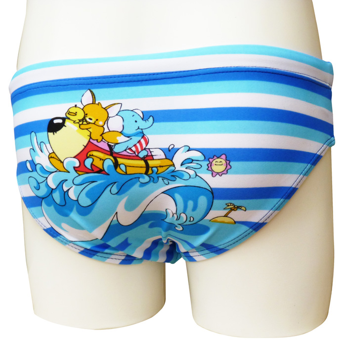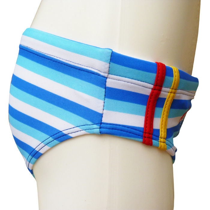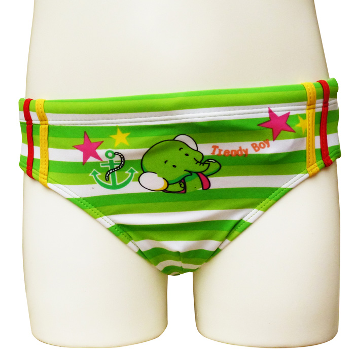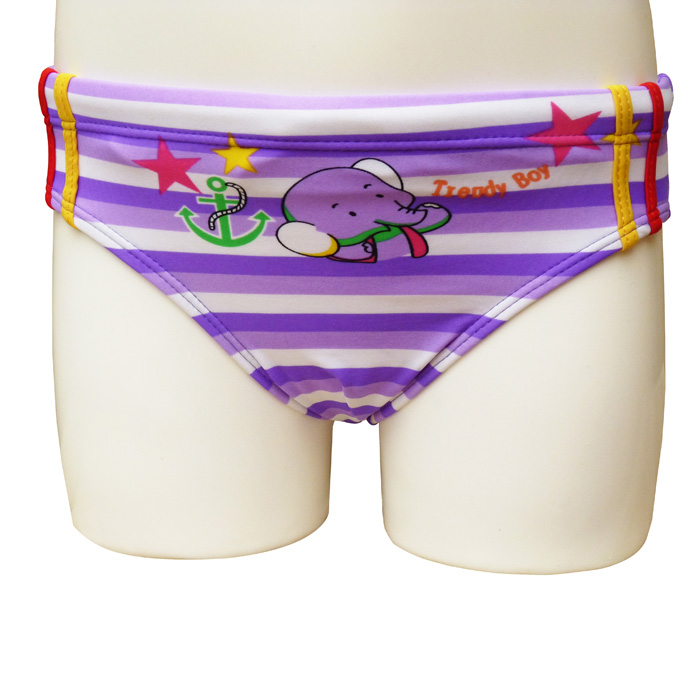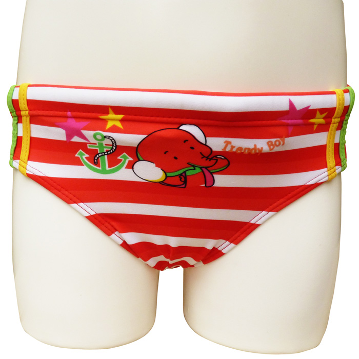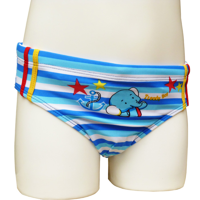 Liquidation Slip de bain à 1.39€HT garçonnet doublé à l'avant. Lacet de resserrage à la taille. Jeux de rayures horizontales avec motif "éléphant, ancre, etc..." sur le devant et sur l'arrière. 4 tailles : 1/2 ans - 3/4 ans - 5/6 ans - 7/8 ans.