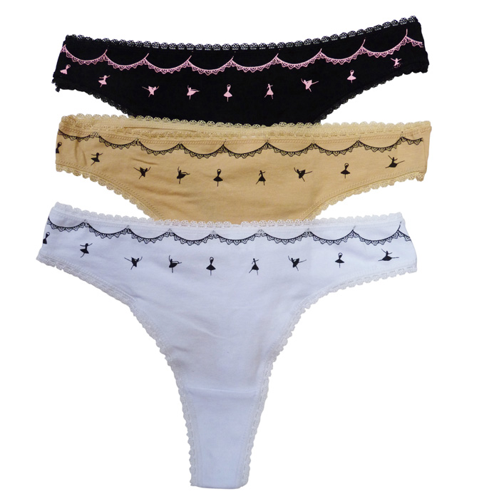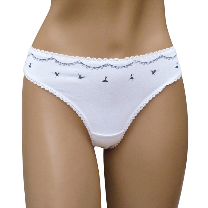 Tanga, coton majoritaire, motif "guirlandes de danseuses" sur le devant, uni à l'arrière. 2 tailles.