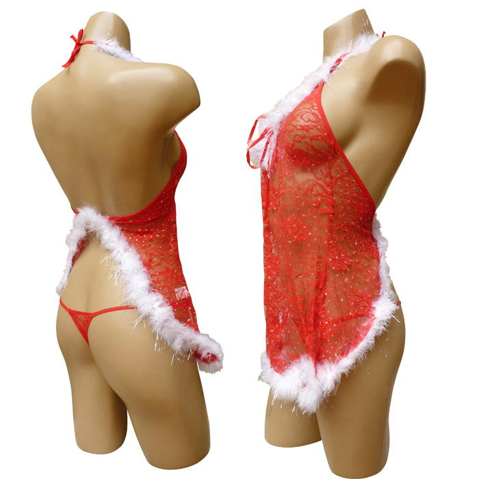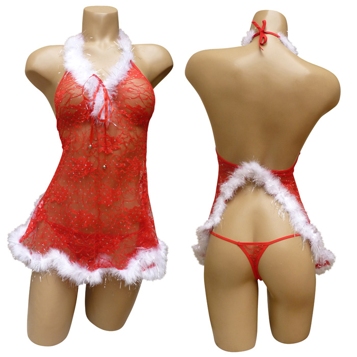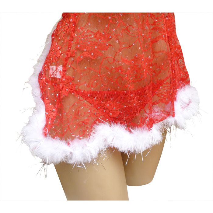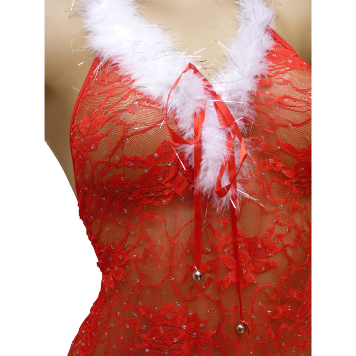Nuisette rouge sexy, "spécial noël", avec tanga, forme évasée sur le bas à l'avant, ouverture sur l'arrière laissant entrevoir le tanga. "Fleurs brodées" sur maille résille stretch, avec pois argenté sur l'ensemble de la nuisette. Bande de fourrure blanche et fils d'argent sur le bord de la poitrine et sur le pourtour en bas, type "flocon de neige". S'attache dans le cou. Tanga, voile stretch avec pois argenté devant et derrière. Talle unique.