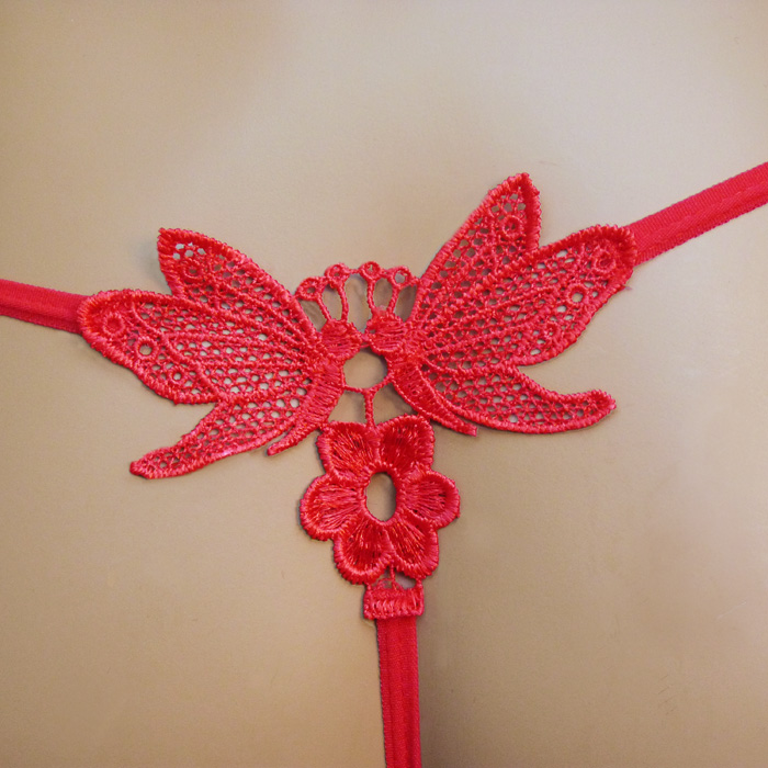 String rouge. Broderie "fleurs" sur maille filet stretch sur le devant. Doublé sur le fond. String orné broderie papillon sur le derrière. Taille unique.