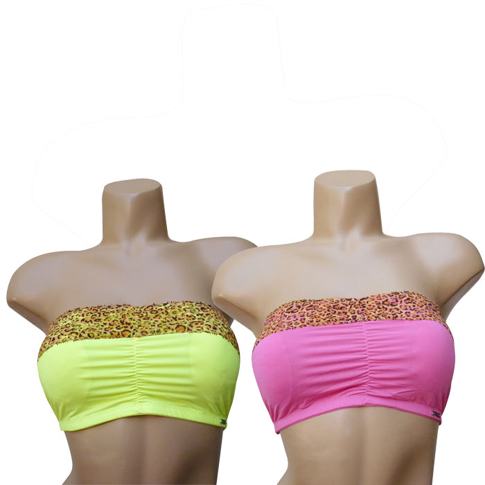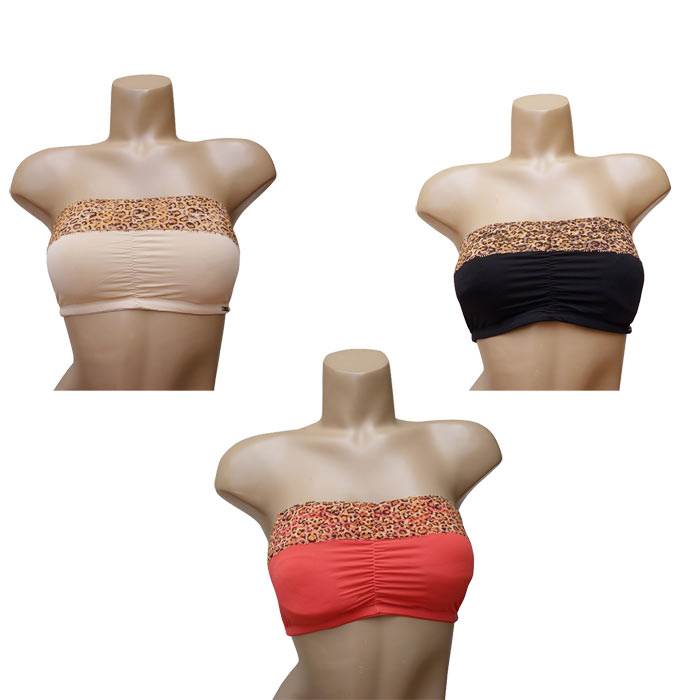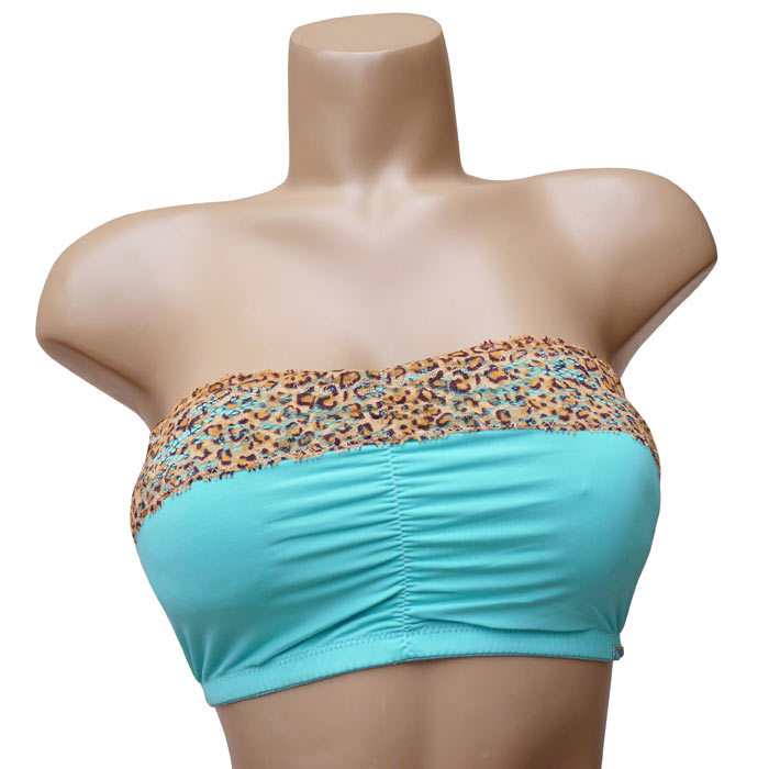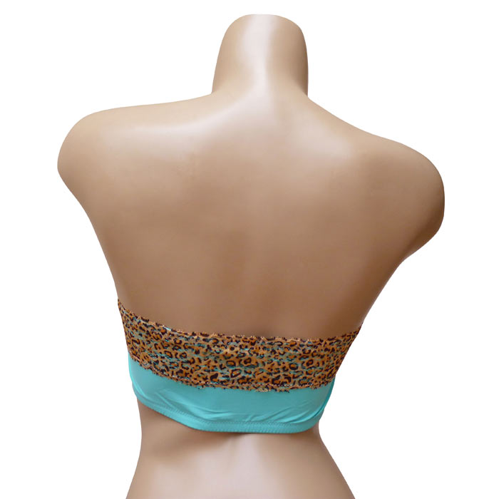 Soutien gorge bandeau, non rembourré avec coussinets amovibles. Soutien gorge bandeau en microfibre Lycra avec sur le haut du bandeau fine dentelle imprimé léopard. 2 tailles : S/M - L/XL.