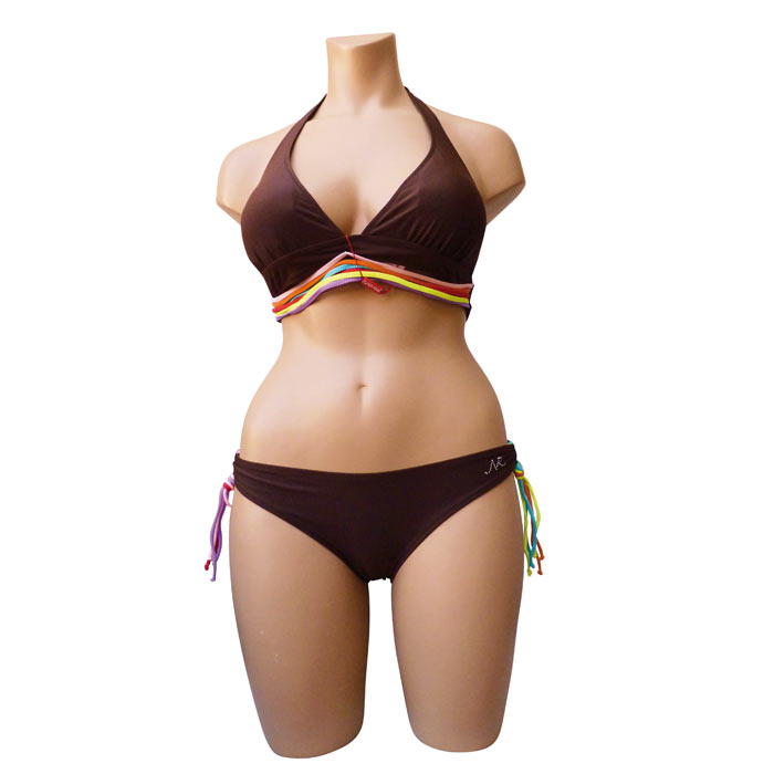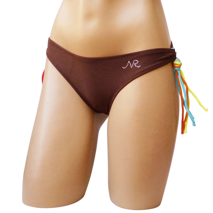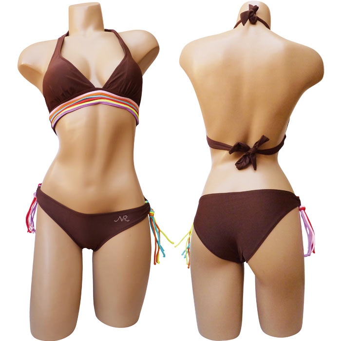 Maillot de bain 2 pièces uni avec slip - Bas du maillot de bain doublé à l'avant. Soutien gorge forme triangle sans armatures, avec mousses amovibles - Soutien gorge à nouer façon foulard au cou et au dos. multi-brides colorées sous le soutien gorge. Slip uni ajustable sur les côtés par des brides multi-colores, strass en forme de lettres "NR" sur un des côtés. 5 tailles.